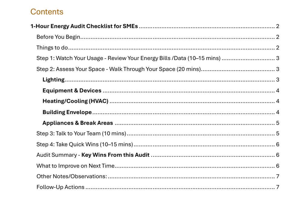 A ready-to-use, editable PDF just action, - A 1-hour walkthrough to uncover hidden energy waste in your office, - Simple prompts that make auditing fast and beginner-friendly, - A checklist you can use solo or with your team, - Instant clarity on what is costing you money and where to start fixing it